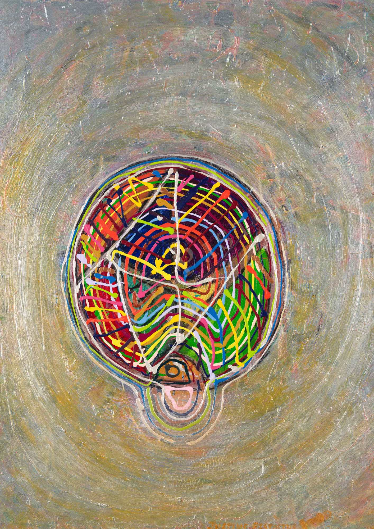 The artist is trying to represent a visceral expression through the artwork by the textures, colours and lines and the very strong circular motion in the centre of the canvas. This artwork draws us within ourselves and the viewer starts to look for solutions. What has the experience meant to me? The eye of the storm. The labyrinth and the maze that helps us document our journey, find direction and identify who we are.